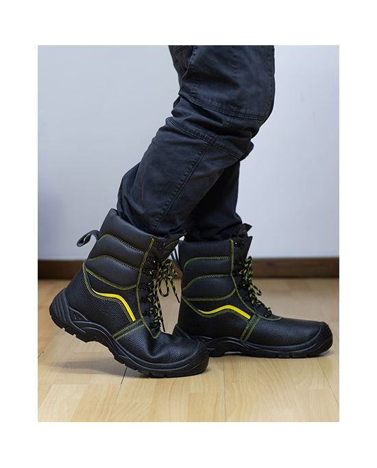 Botas industriais, biqueiras de aço e protecção contra quedas de objectos.